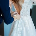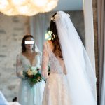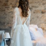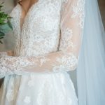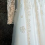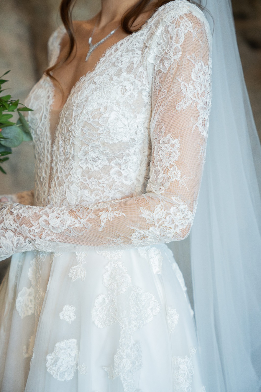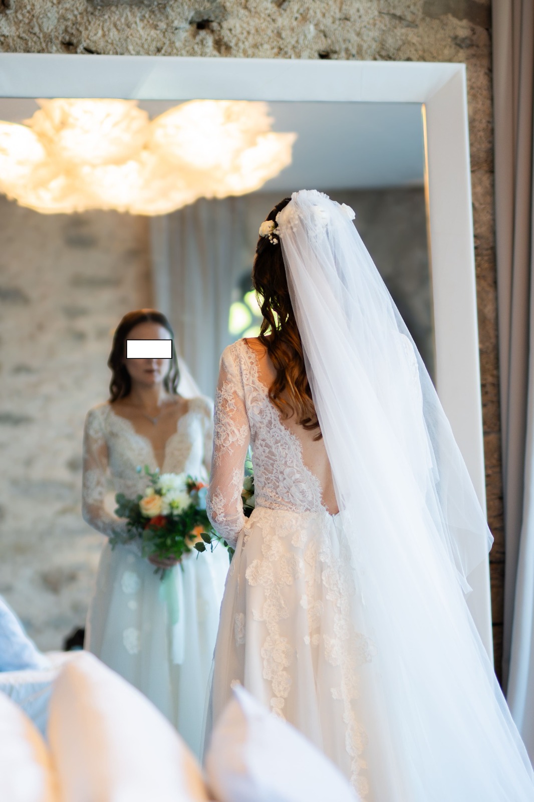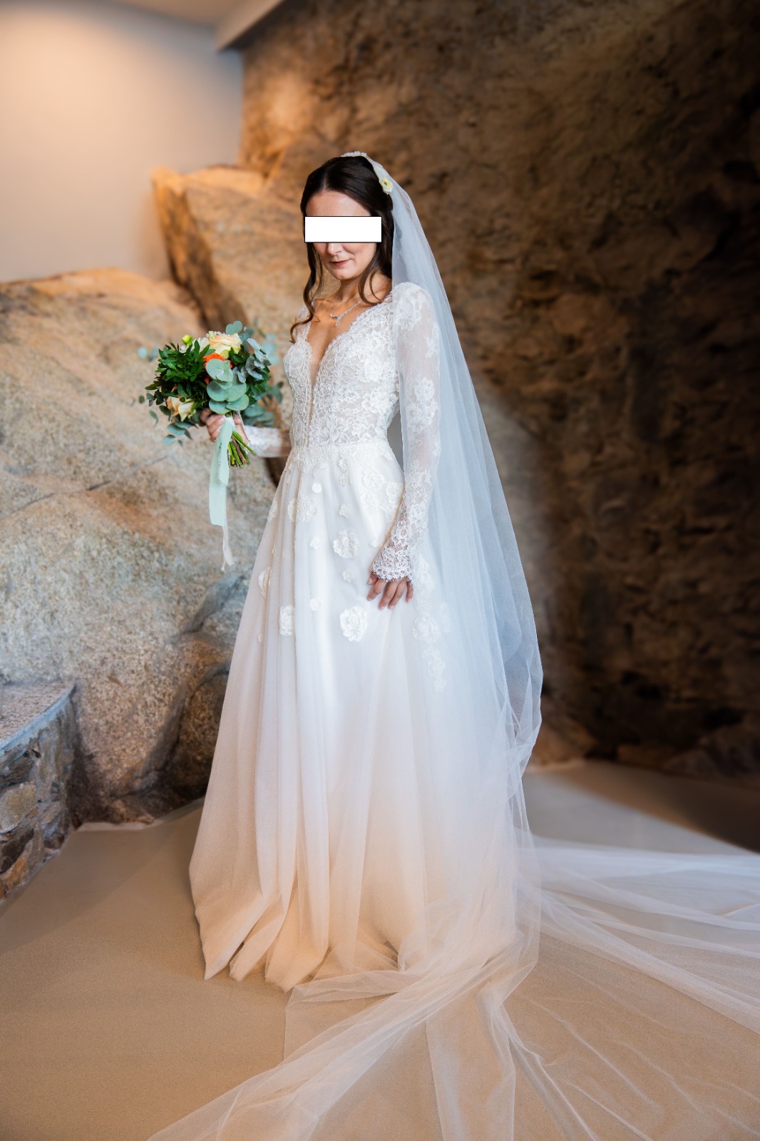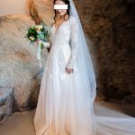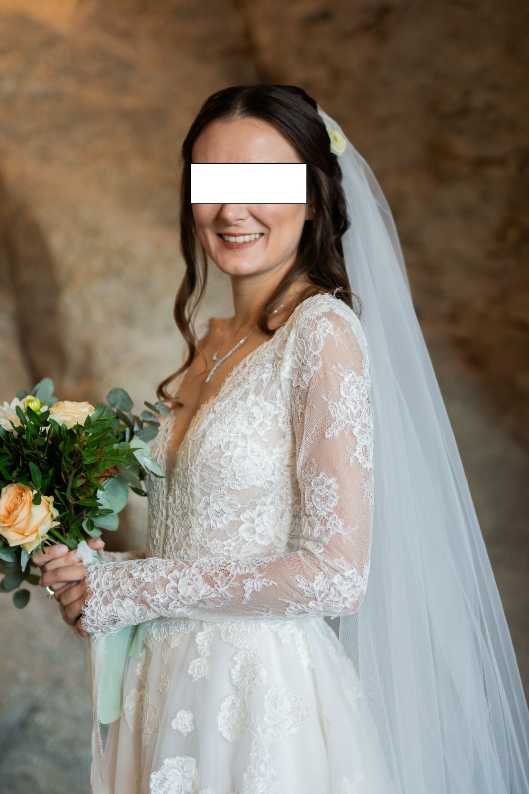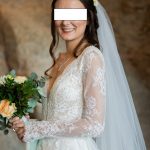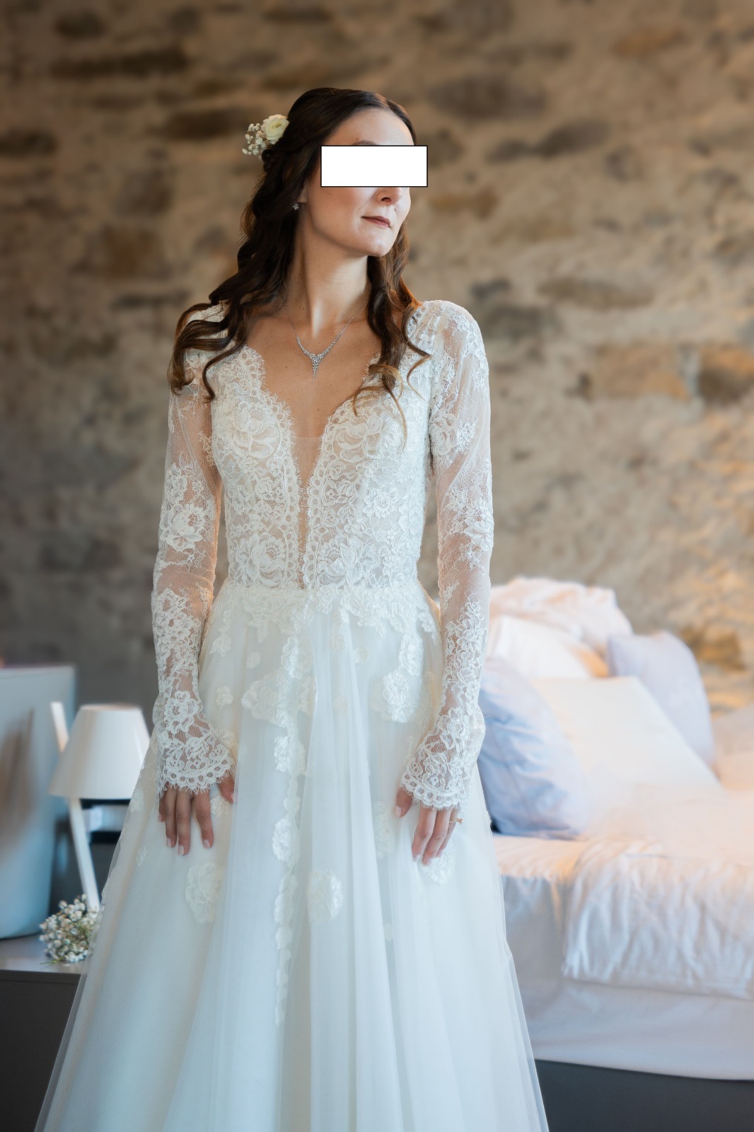Fatto su misura in Turchia dallo stesso produttore che rifornisce Pronovias in Italia. Abito lavorato in pizzo francese nella parte superiore con scollatura a V frontale e sul retro. Nella parte inferiore e' composto in tulle. Il colore e' un crema chiaro. Usato solo 8 ore e portato in tintoria per lavaggio.