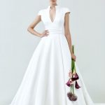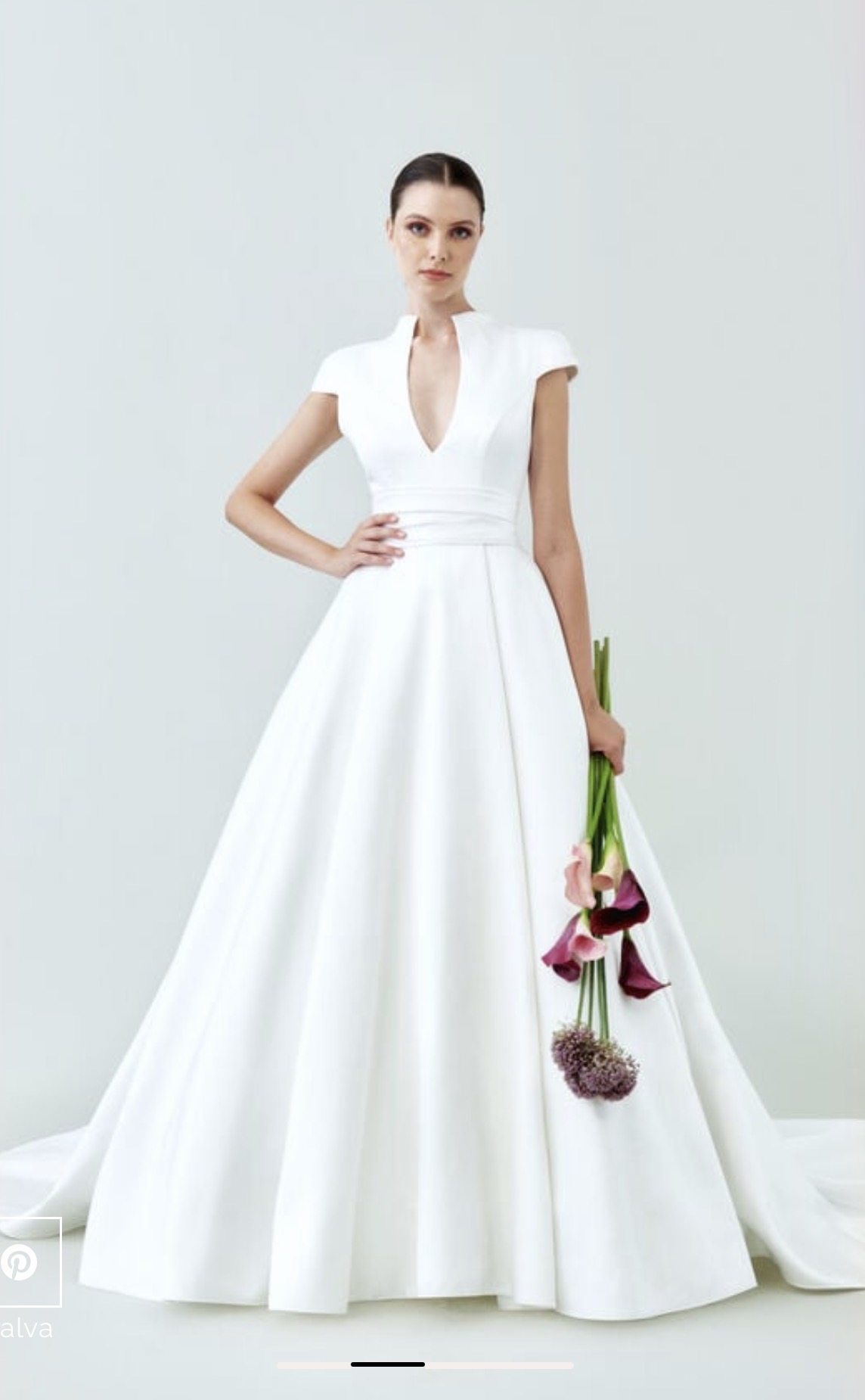 Raffinato corpino di mikado con delicate alette a kimono e profonda scollatura a V davanti e sagomata a goccia sulla schiena. Il punto vita è delineato da una cintura drappeggiata effetto couture con importante fiocco dietro e gala asimmetrica che ricade sulla coda. Voluminosa gonna con eleganti pieghe sartoriali e principesco strascico arrotondato al fondo. Abito attualmente in collezione da atelier Eme