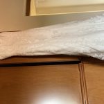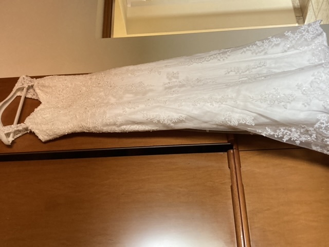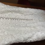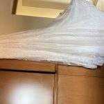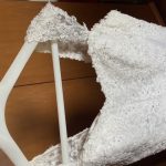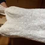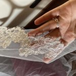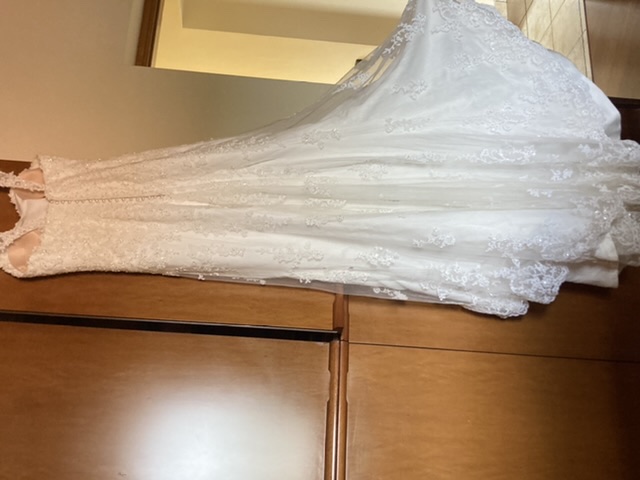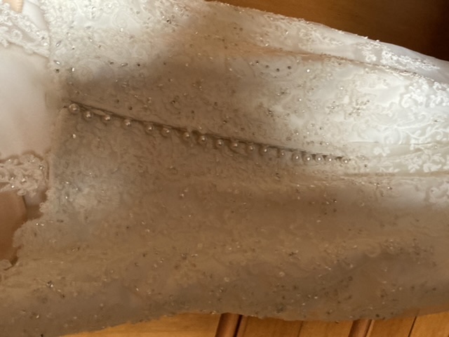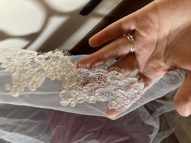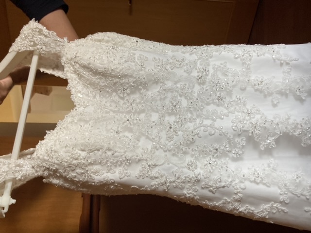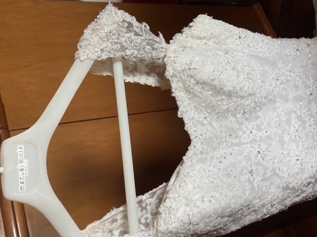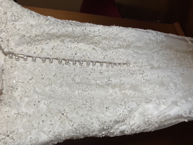 Abito romantico in tulle e in pizzo, impreziosito da Swarovski e perline maggiormente nella parte superiore del corpetto. Presenta una delicata scollatura a cuore, con spalline removibili. La schiena è delineata da delicati bottoncini che regalano sensualità e un tocco di romanticismo senza tempo. L’aspetto principesco è dato dalla maestosa coda don do imponenza e determinazione nel percorrere la navata, oltre ad un velo di (3 m), anch’esso in tulle e con ricami in pizzo e Swarovski.
