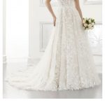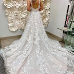 Abito dallo stile romantico boho chic, in tulle color avorio con raffinati ricami floreali 3D che scendono armoniosamente dal corpetto fino alla gonna e allo strascico.