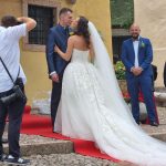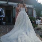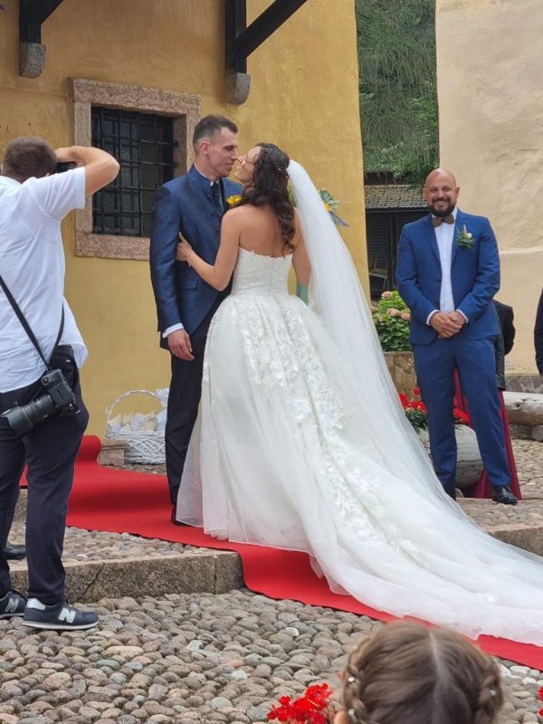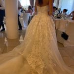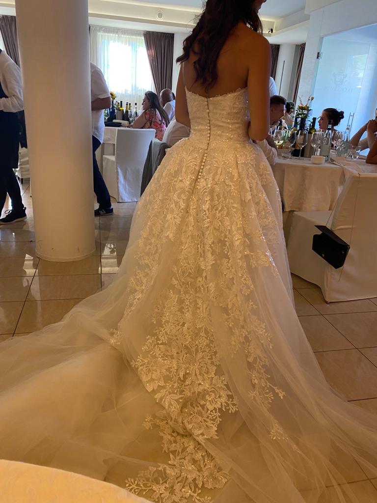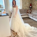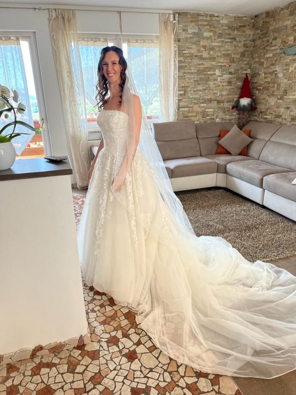 Corpino e con con ricami in pizzo e piccoli punti luce. Strascico lungo 3m.