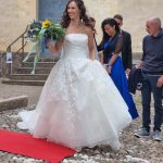 Abito da sposa stile principesco, con corpetto steccato, senza spalline, gonna ampia in tulle.